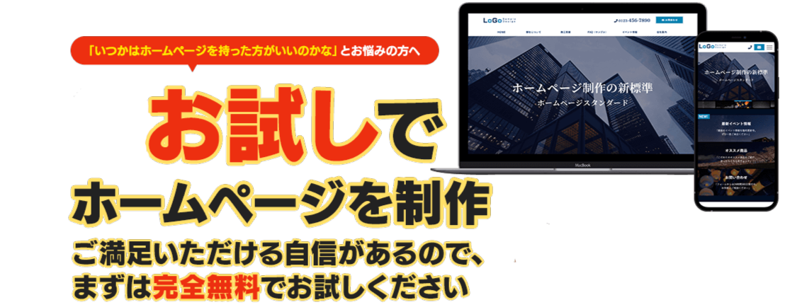 現在、発注前に完成イメージが確認できる「お試し無料ホームページ制作」を実施中です。この機会にぜひとも弊社でのホームページ作成をご検討ください。